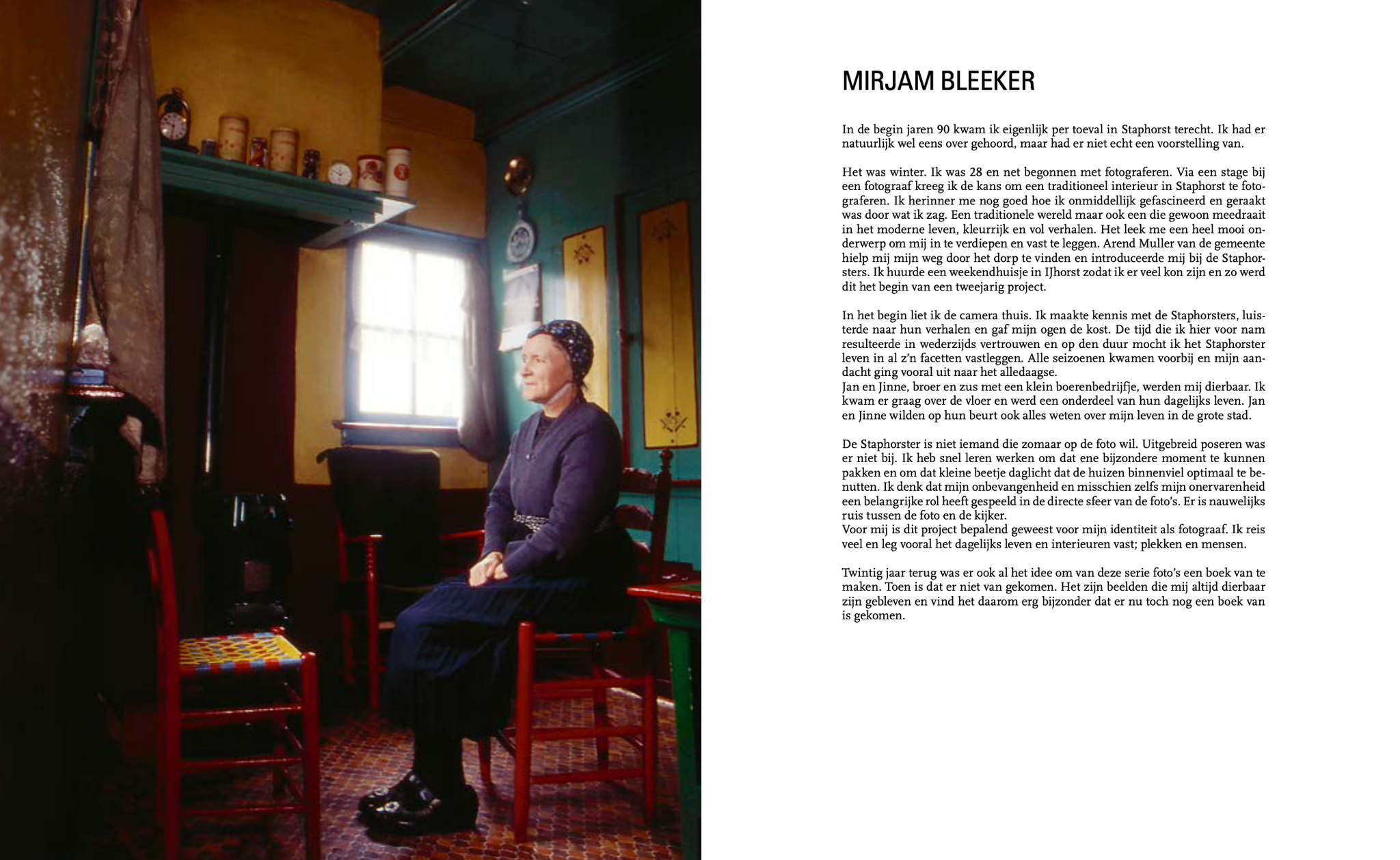 Fotografe Mirjam Bleeker verbleef er tussen 1992 en 1994 regelmatig. Ze raakte vertrouwd met Staphorst en diens inwoners. Haar verblijf leverde een reeks buitengewoon mooie, intieme en interessante foto’s op. Het boek geeft een prachtig beeld van de Staphorster cultuur aan het eind van de twintigste eeuw. Er waren nog mannen en kinderen die de streekeigen kleren droegen. Bovendien waren er nog kleinschalige boeren- bedrijven met soms maar enkele koeien. De melk werd in bussen aan de diek gezet. Tot op de dag van vandaag zie je in Staphorst nog vrouwen in streekdracht, maar de rest is voorgoed verleden tijd.